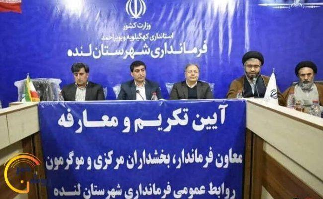 بر این اساس موسی محتشم به عنوان معاون فرماندار شهرستان لنده وامین شفایی و عادل مرادی به ترتیب به عنوان بخشدار مرکزی و بخشدار موگرمون این شهرستان منصوب شدند.