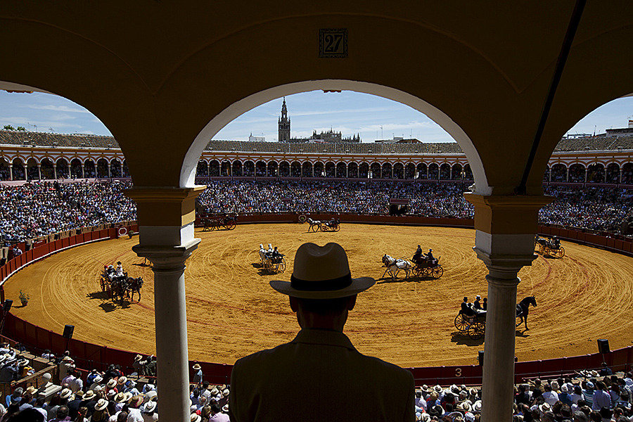 مردی نمایش کالسکه های قدیمی را در زمین گاو بازی شهر «سویل» اسپانیا تماشا میکند. (Reuters)