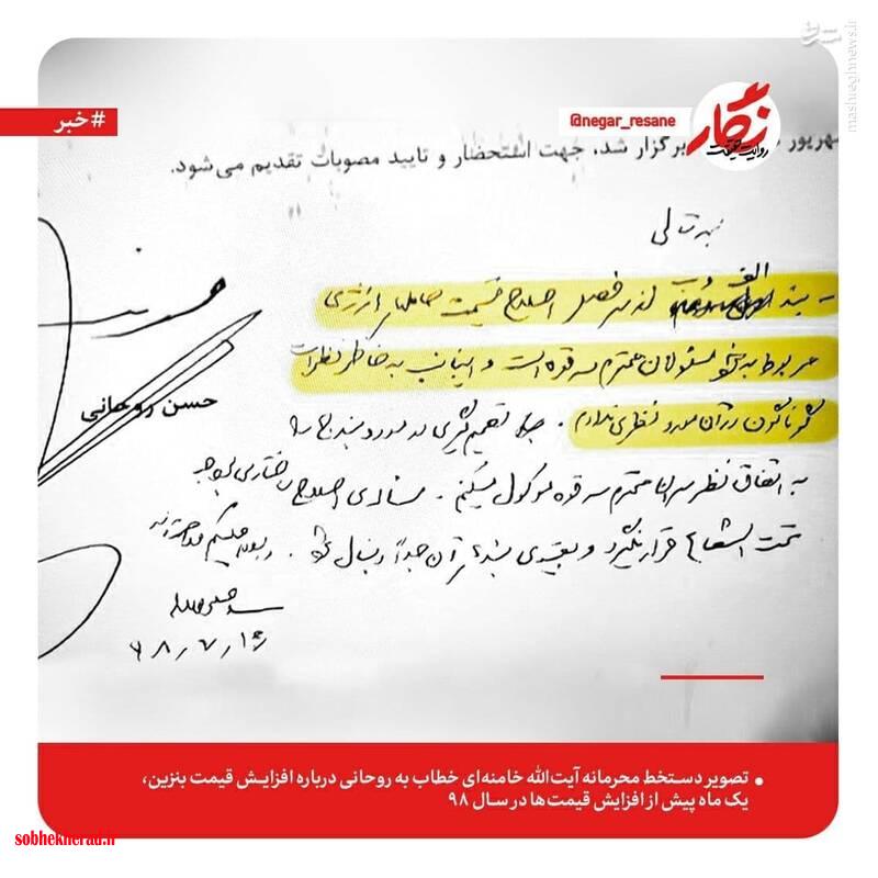 دستخط محرمانه رهبر انقلاب خطاب به روحانی در موضوع افزایش قیمت بنزین در سال ۹۸/ عکس