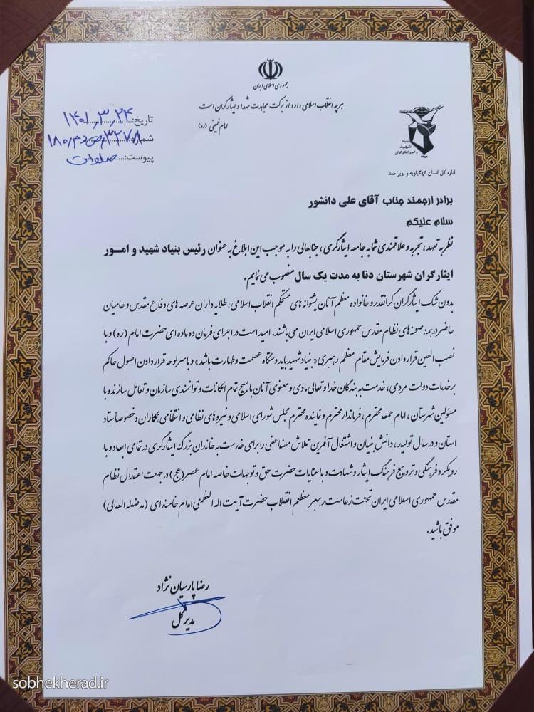 همچنین با حکم مدیر کل بنیاد شهید و امور ایثارگران استان “علی دانشور” به عنوان سرپرست بنیاد شهید و امور ایثارگران دنا منصوب شد.